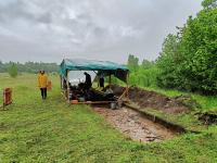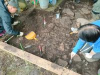 В ходе раскопок, несмотря на дождливую погоду, были заложены три разведывательные траншеи в области, где не сохранились каменные обкладки и плиты. В одной из траншей исследователи обнаружили четыре погребения: одно принадлежало взрослому человеку и находилось под невысокой насыпью, а три других были детскими и располагались в грунтовых ямах. Эти детские захоронения находились в стороне от сохранившихся наземных погребальных конструкций и не имели никаких обозначений на поверхности.