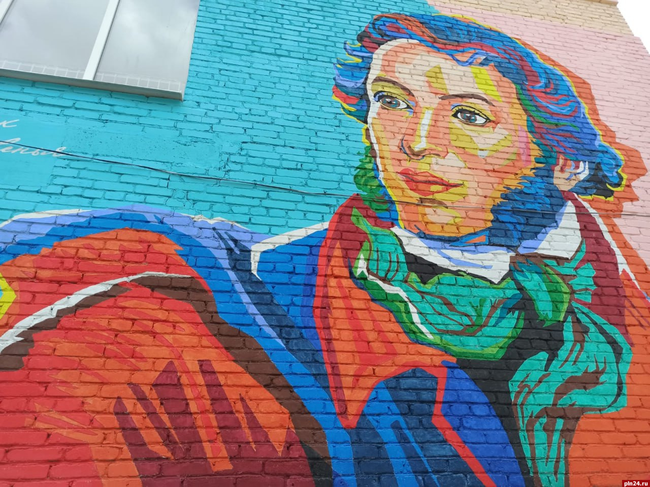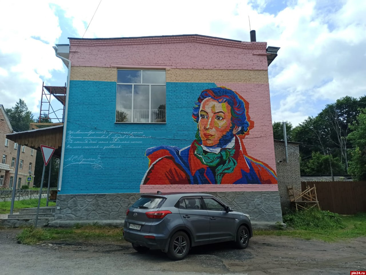 Мурал с изображением великого писателя Александра Пушкина появился на фасаде бывшего универмага в Пушкинских Горах, сообщили Псковской Ленте Новостей в министерстве культуры Псковской области.