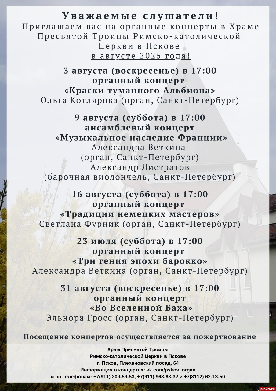 Пять концертов органной музыки состоятся в храме Пресвятой Троицы Римско-католической церкви на улица Плехановский Посад, 64 в Пскове в августе. Об этом Псковской Ленте Новостей сообщили организаторы.