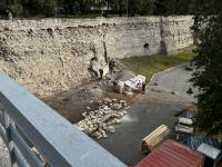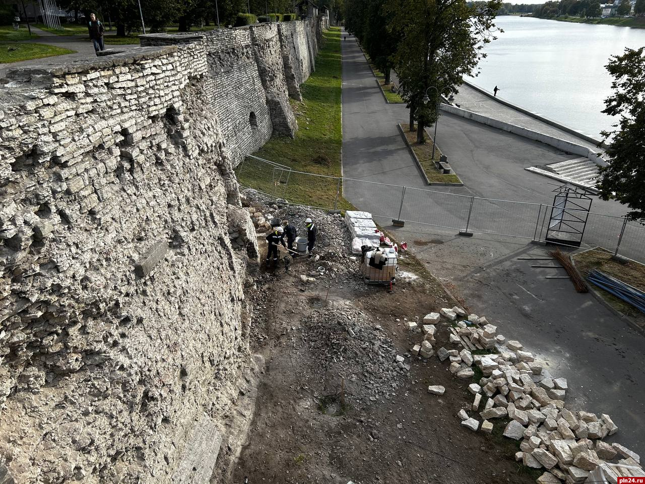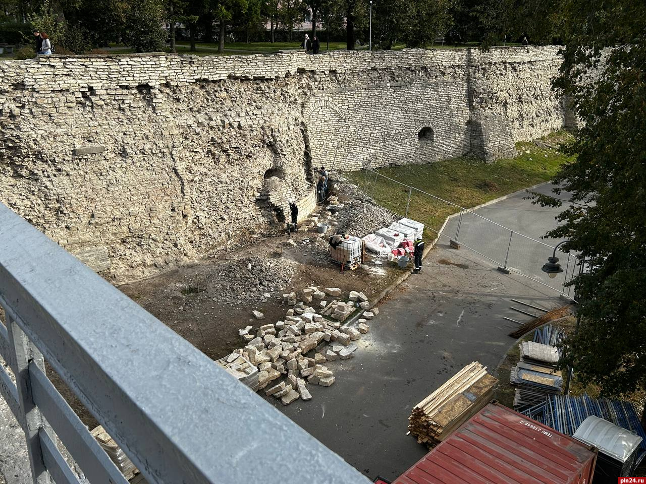 В Пскове начался ремонт стены Окольного города в районе Ольгинского моста, передает корреспондент Псковской Ленты Новостей.