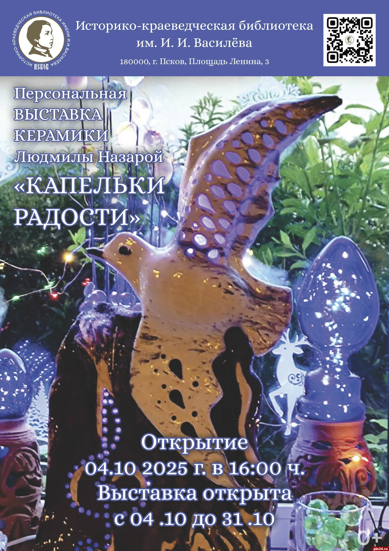 Историко-краеведческая библиотека имени Ивана Василёва приглашает в субботу, 4 октября, на открытие выставки «Капельки радости», сообщили Псковской Ленте Новостей в библиотеке. Это выставка произведений известного псковского художника-керамиста Людмилы Назарой.