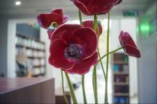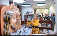 Теперь пространство напротив стойки регистрации читателей и выдачи книг занимает экспозиция из рельефов, ваз, тарелок, светильников, фигурок и целых скульптурных групп.