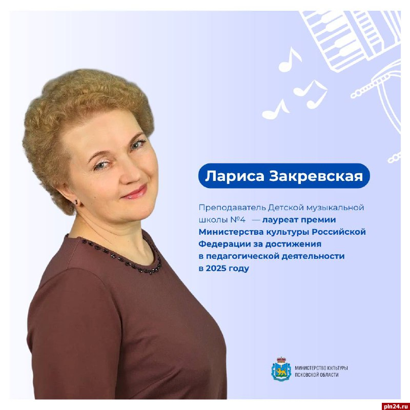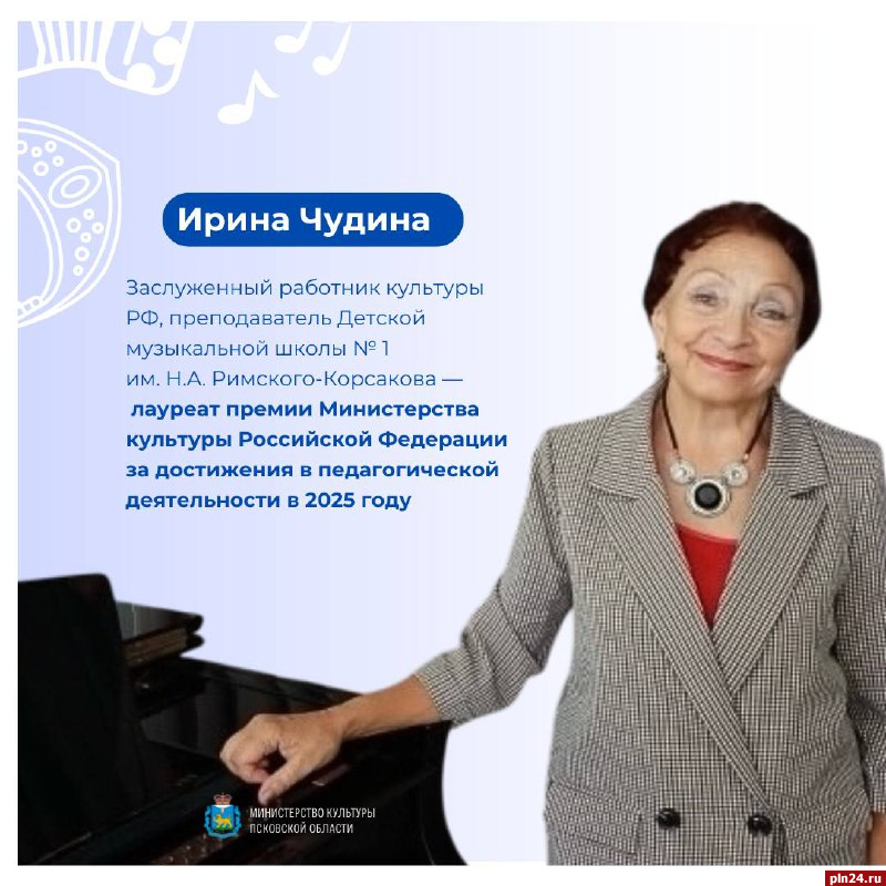Два преподавателя из Пскова вошли в число лауреатов общероссийской премии «Лучший преподаватель в области музыкального искусства». Высокой награды Министерства культуры Российской Федерации удостоены Ирина Чудина из Детской музыкальной школы №1 имени Н.А. Римского-Корсакова и Лариса Закревская из Детской музыкальной школы №4. Об этом Псковской Ленте Новостей сообщили в министерстве культуры Псковской области.