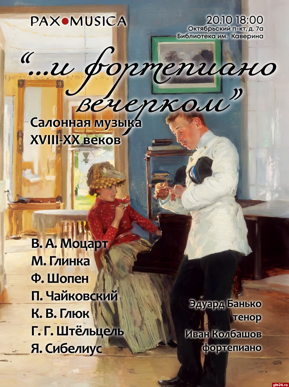 Проект PAX MUSICA представит программу «… и фортепиано вечерком» салонной музыки XVIII – XX веков в Пскове, сообщили Псковской Ленте Новостей организаторы мероприятия.