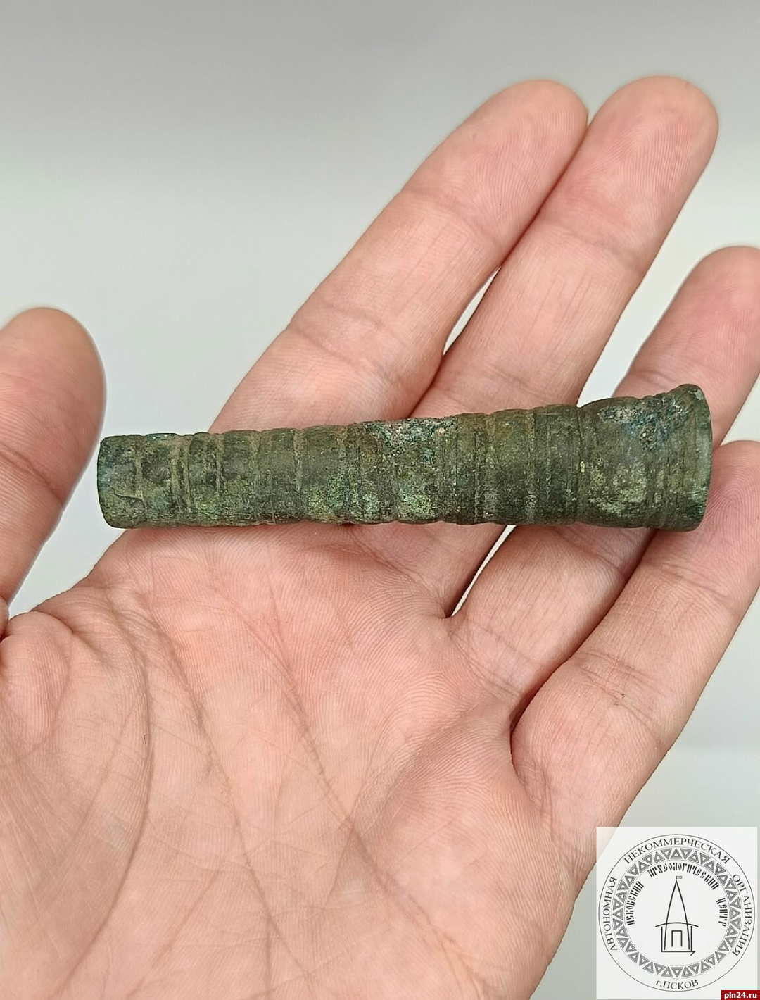 На фотографиях бронзовая трубка длиной 7,2 см, которая расширяется книзу. Археологи отметили, что подобные трубки встречаются в культурном слое Пскова и в могильниках Северо-Запада. Часто внутри таких трубок находят швейные иглы.