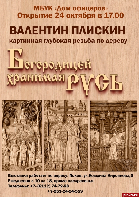 Первая выставка — это уникальная коллекция глубоких резных картин Валентина Плискина под названием «Богородицей хранимая Русь». Открытие состоится в 17:00 и обещает погрузить зрителей в атмосферу русской духовности и традиций через мастерство резьбы по дереву.