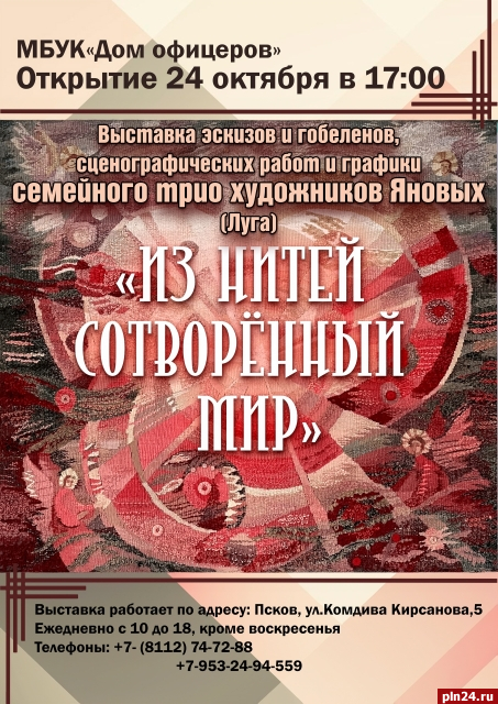 Выставки будут работать ежедневно с 10:00 до 18:00, кроме воскресений по адресу: город Псков, улица Комдива Кирсанова, дом 5.