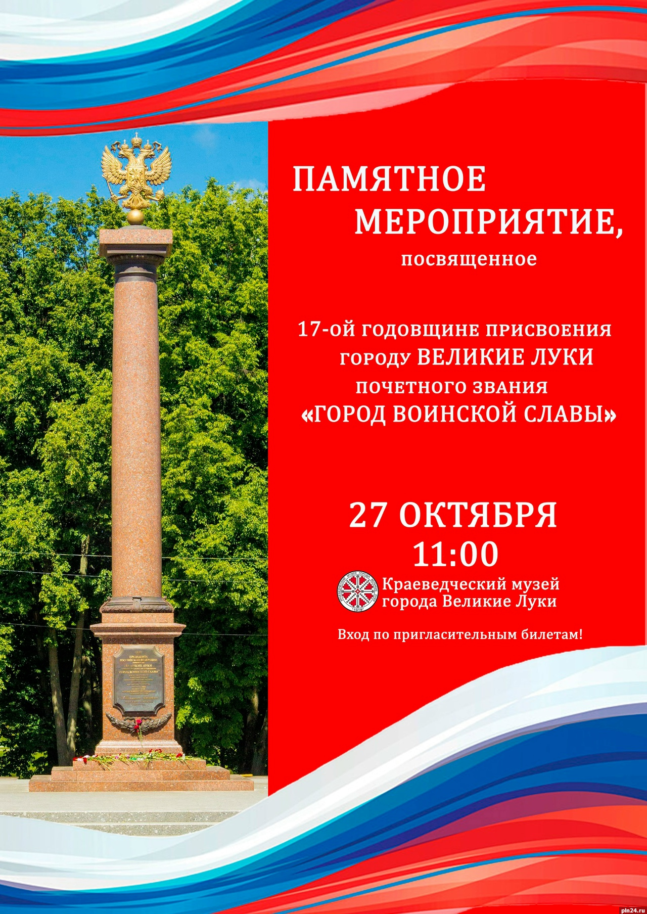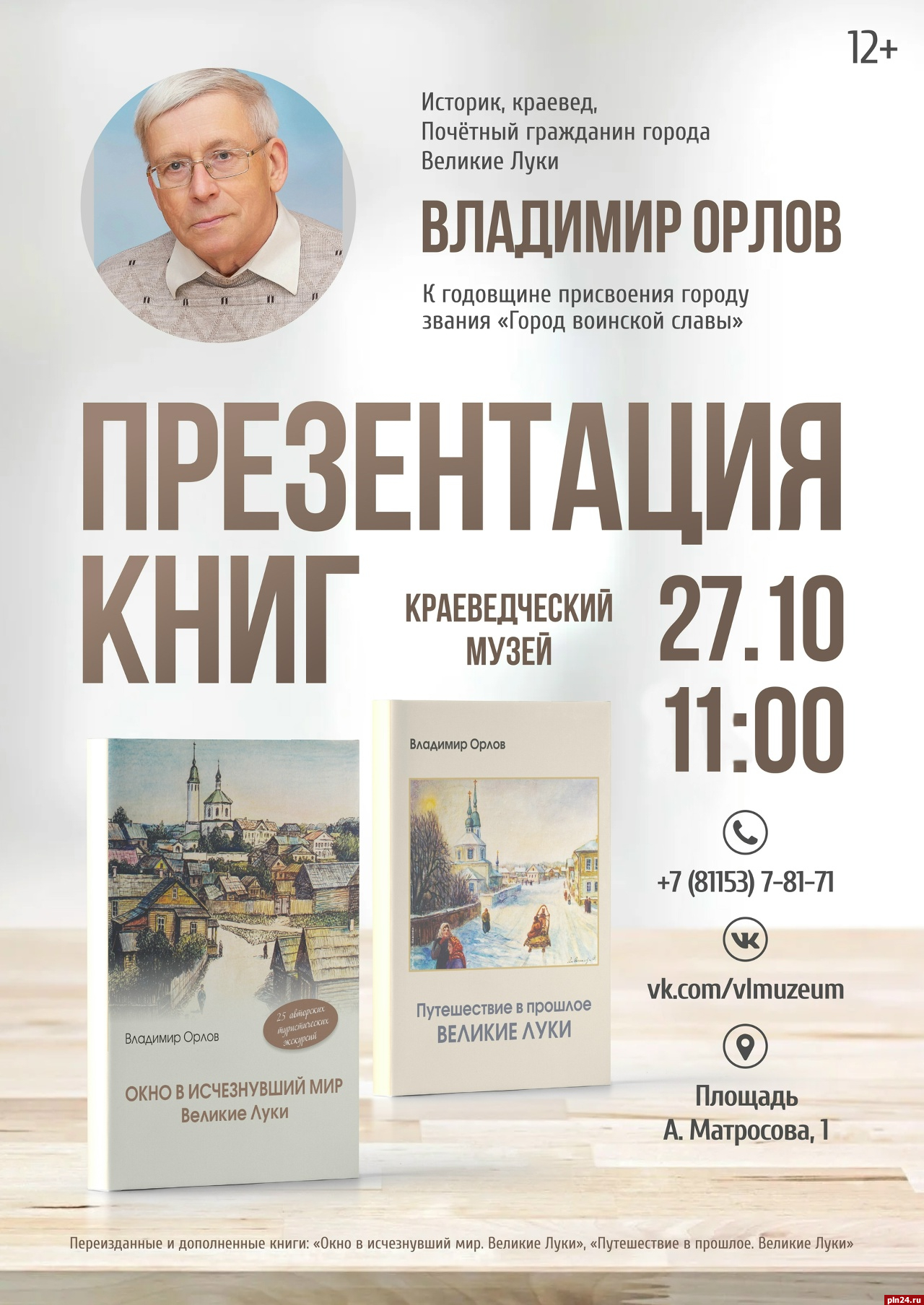 Памятное мероприятие, приуроченное к 17-й годовщине присвоения Великим Лукам почётного звания «Город воинской славы», с презентацией книг историка и краеведа, почётного гражданина города Владимира Орлова состоится в Краеведческом музее Великих Лук 27 октября в 11:00, сообщили Псковской Ленте Новостей в музее.
