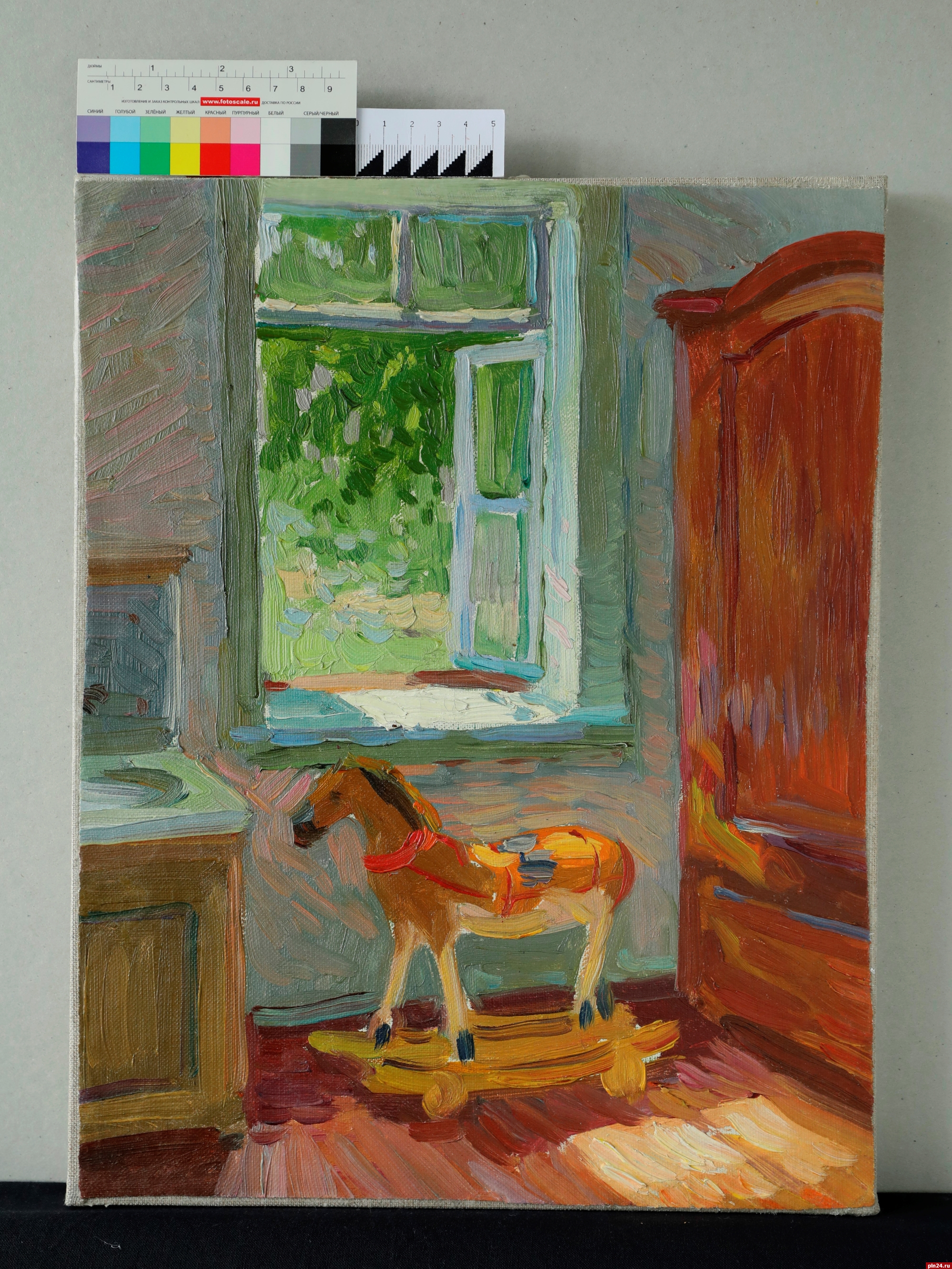 На картине изображен интерьер комнаты у раскрытого окна, сквозь которое падают лучи солнечного света и виден зеленый сад. В комнате стоят детская деревянная лошадка, коричневый шкаф и умывальник.