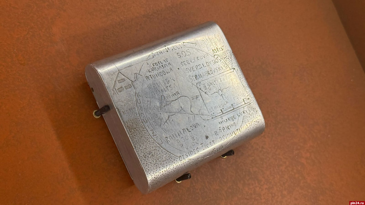 Принадлежавший Харальду Рюютелю портсигар был сделан в 1942 году, во время Великолукской наступательной операции. В районе Великих Лук тогда развернулись тяжелые кровопролитные бои, в ходе которых враг понес тяжелые потери, в том числе было уничтожено много немецкой военной техники. Представленный в витрине портсигар был сделан из крыла одного из сбитых фашистских самолетов. А затем Харальд выгравировал на его алюминиевой крышке названия населенных пунктов, отмечающих боевой путь 8-го Эстонского стрелкового корпуса. В нижней части портсигара размещена надпись на эстонском языке — «В поисках своего пути». В 1961 году ветеран лично передал реликвию в Псковский музей-заповедник.