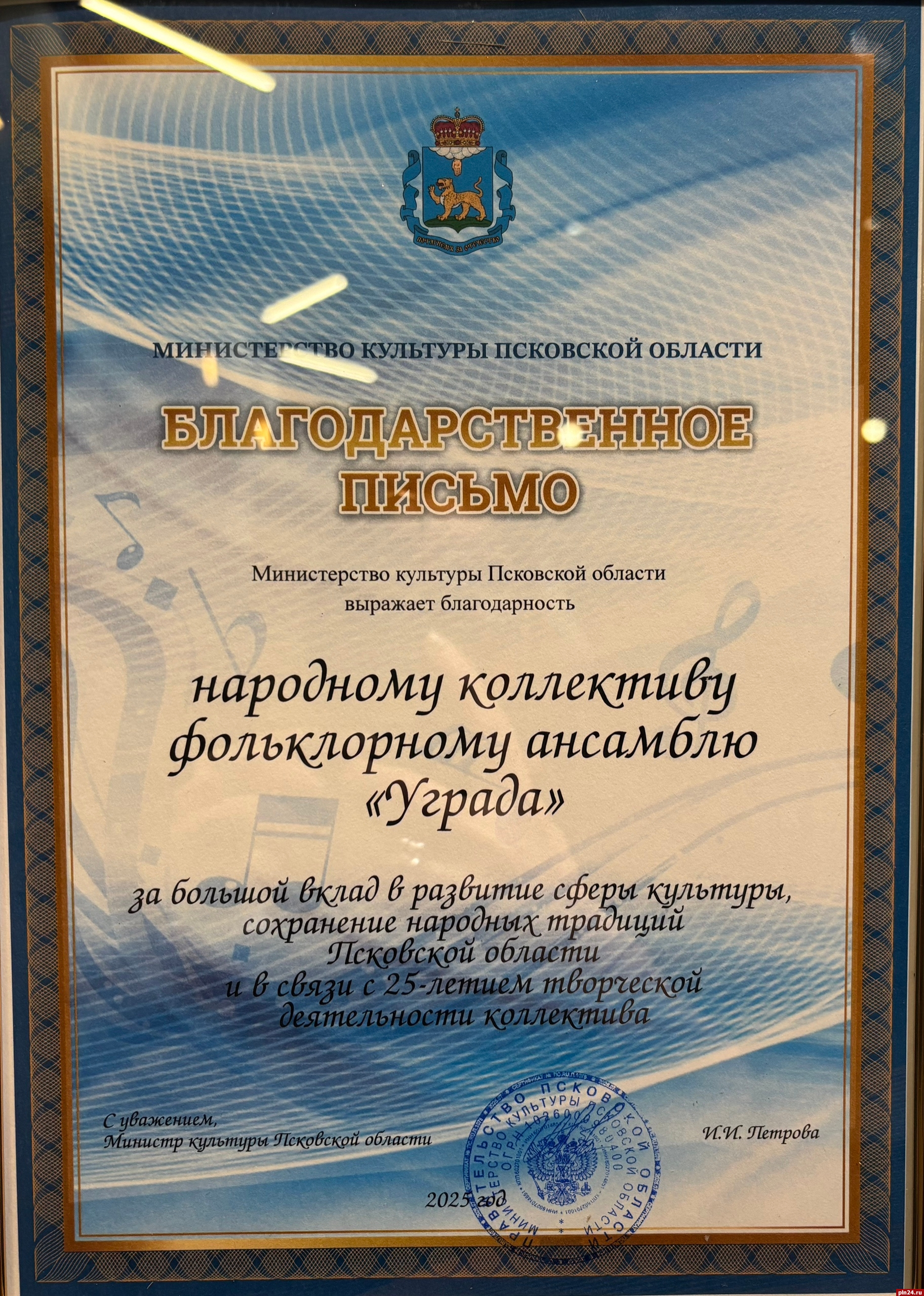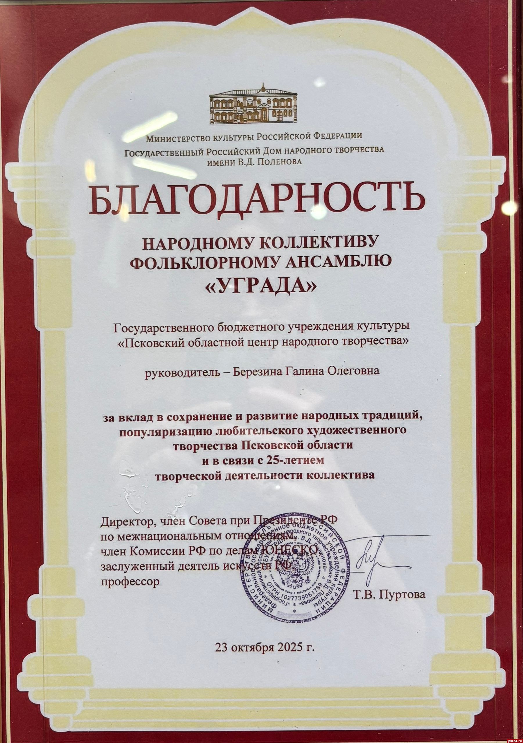 Народный коллектив фольклорного ансамбля «Уграда» отметил свой 25-летний юбилей сегодня, 25 октября, сообщили Псковской Ленте Новостей представители ансамбля.
