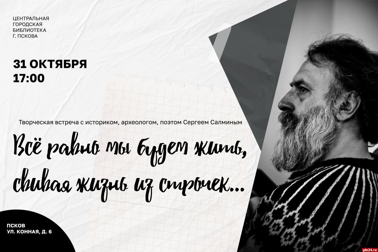 Творческий вечер археолога и военного историка Сергея Салмина «Все равно мы будем жить, свивая жизнь из строчек...» пройдёт в Центральной городской библиотеке 31 октября. На вечере пройдет авторское чтение поэтических текстов и представление книги прозы Сергея Салмина «Короли за морями». Об этом Псковской Ленте Новостей сообщили организаторы.