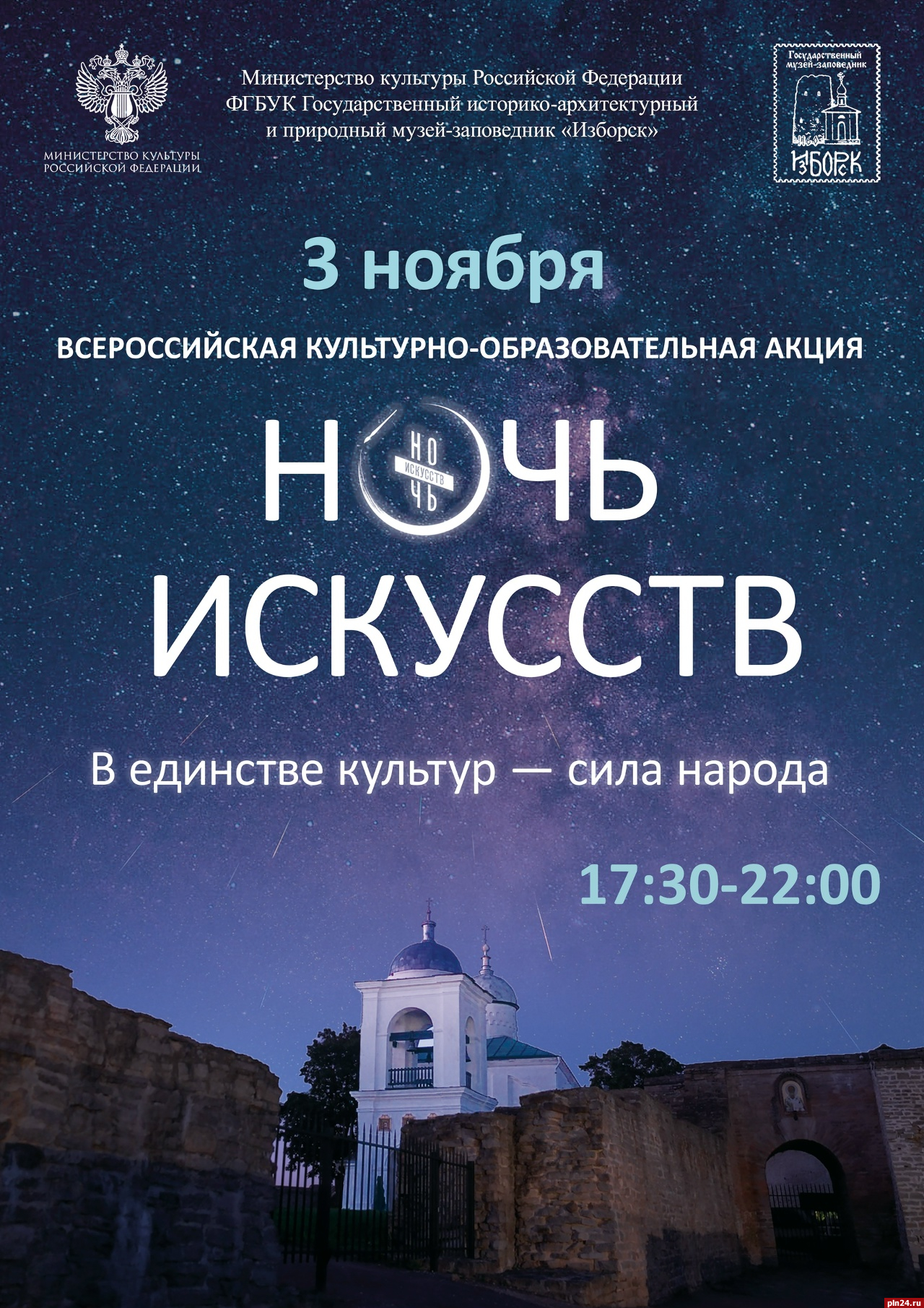 Начнем нашу радиопередачу с актуального и интересного анонса. Как вы знаете, шестидневная рабочая неделя конца октября–начала ноября завершится тремя выходными, которые будет венчать государственный праздник – День народного единства, с которым я всех нас, пользуясь случаем, заранее поздравляю! А накануне праздника, 3 ноября, в выходной понедельник, в нашей стране пройдет традиционная всероссийская культурная акция «Ночь искусств». В этом году она получила название-подзаголовок: «В единстве культур – сила народа». И с этим тезисом нельзя не согласиться. В нашей многонациональной стране сила народа заключена в многообразии и единстве культур. Мультикультурализм – это на самом деле общемировой тренд, и Россия здесь, начиная с первой половины ХХ столетия, а то и раньше, была впереди планеты всей. Государственный музей-заповедник «Изборск», разумеется, как всегда, присоединится к всероссийской культурной акции, ведь что такое Изборск, как не место силы? Мы ждём вас на наших интерактивных программах, мастер-классах и вечерних экскурсиях!