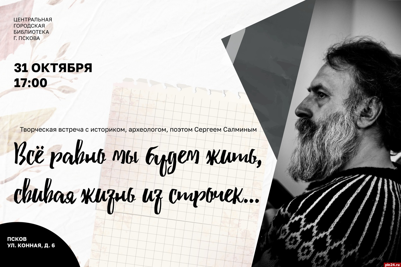 Археолог и военный историк Сергей Салмин провел творческий вечер «Всё равно мы будем жить, свивая жизнь из строчек…» в Центральной городской библиотеке Пскова, сообщили Псковской Ленте Новостей в учреждении.