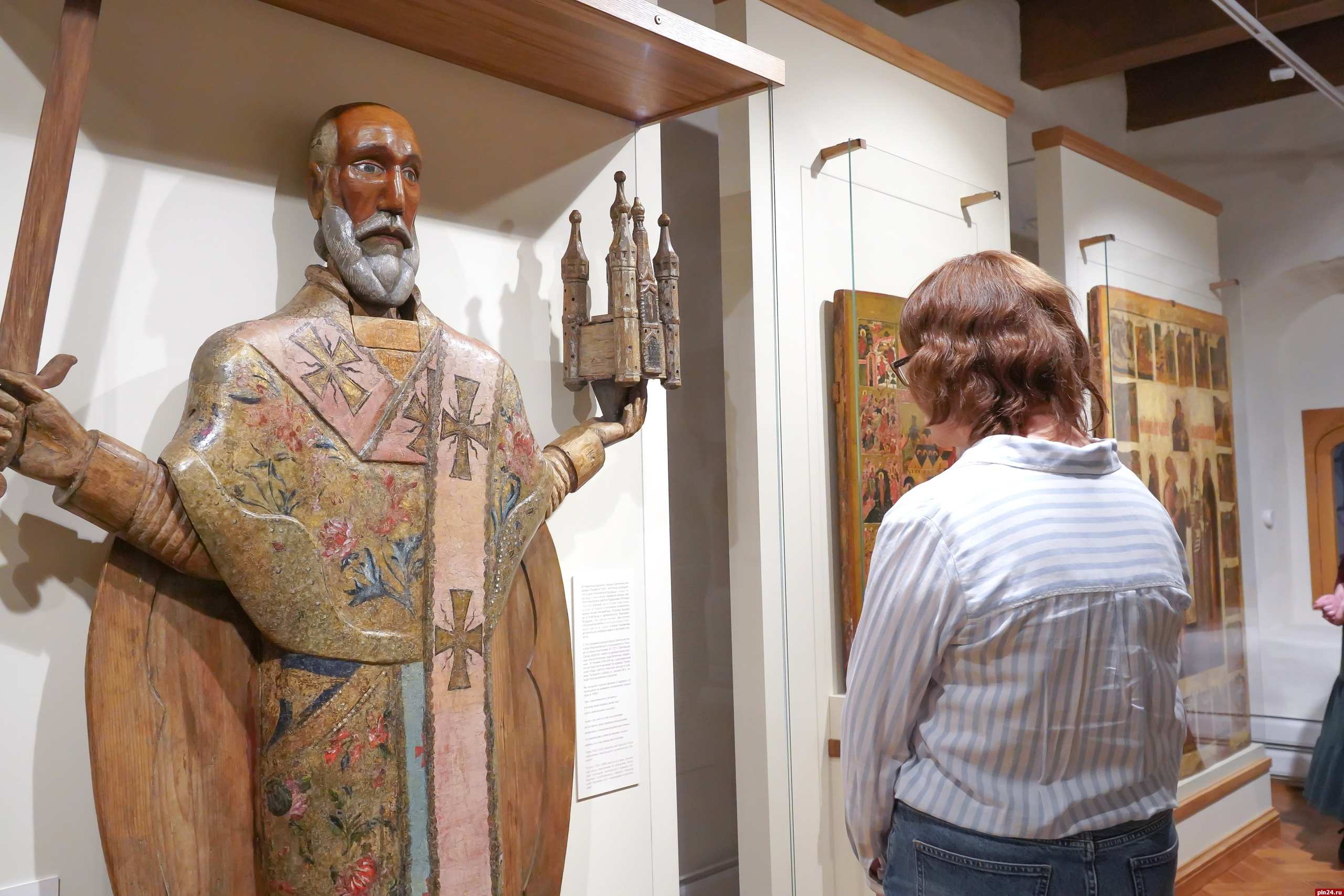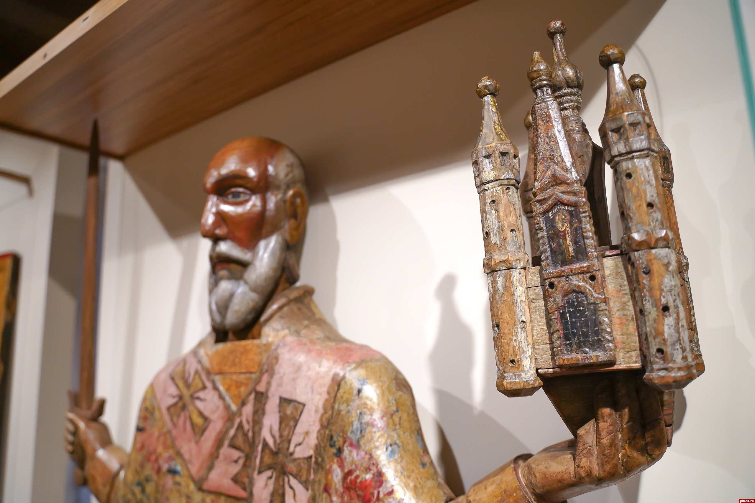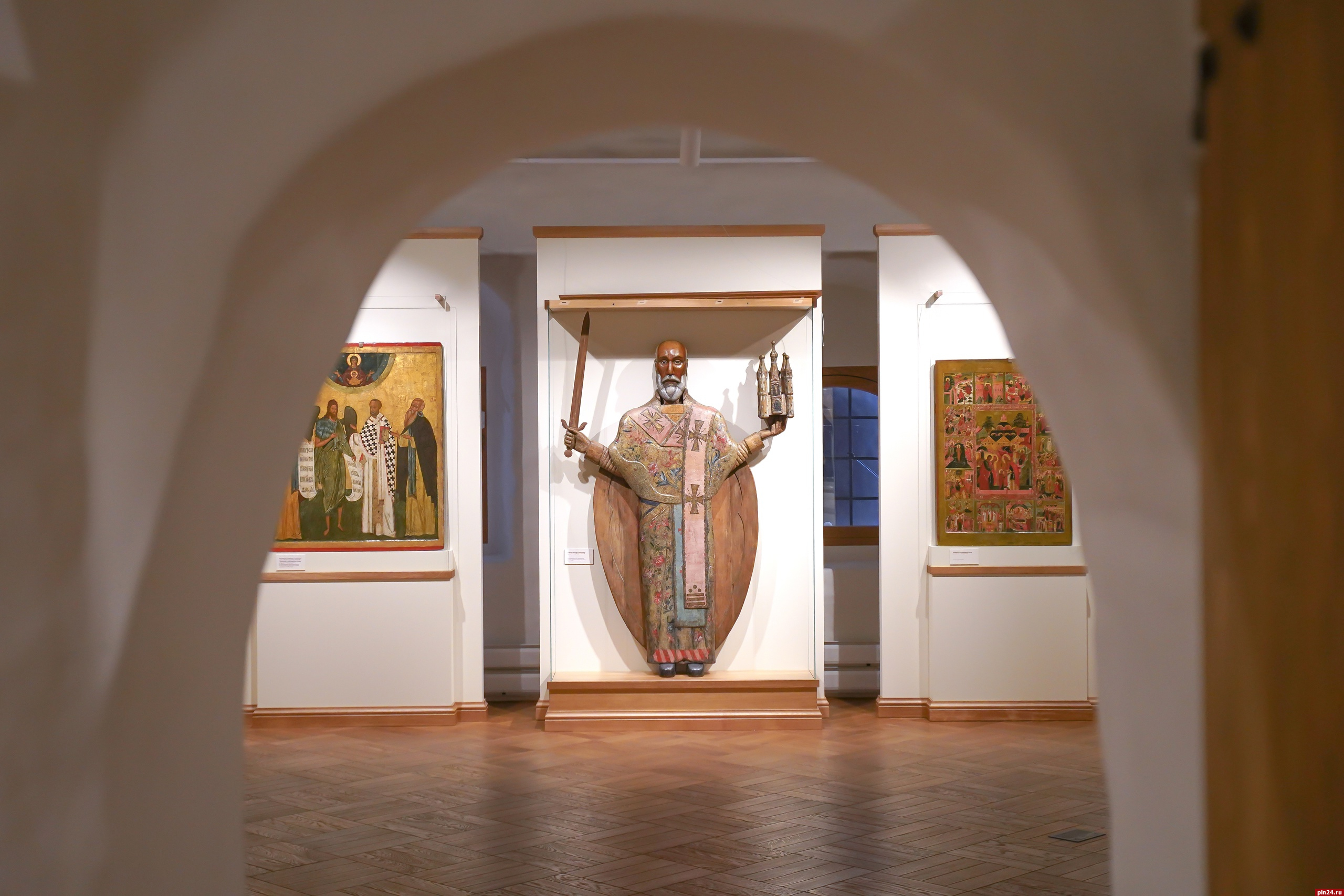 Посетители смогут ознакомиться с псковскими иконами XIV–XVII веков. На выставке представили более 100 сюжетов и персонажей из ветхозаветной и новозаветной истории. Среди уникальных экспонатов — икона «Мирожская Оранта» с изображением князя Довмонта, икона «Святой Николай Чудотворец» с необычными клеймами и апостольский ряд церкви Успения с Пароменья.