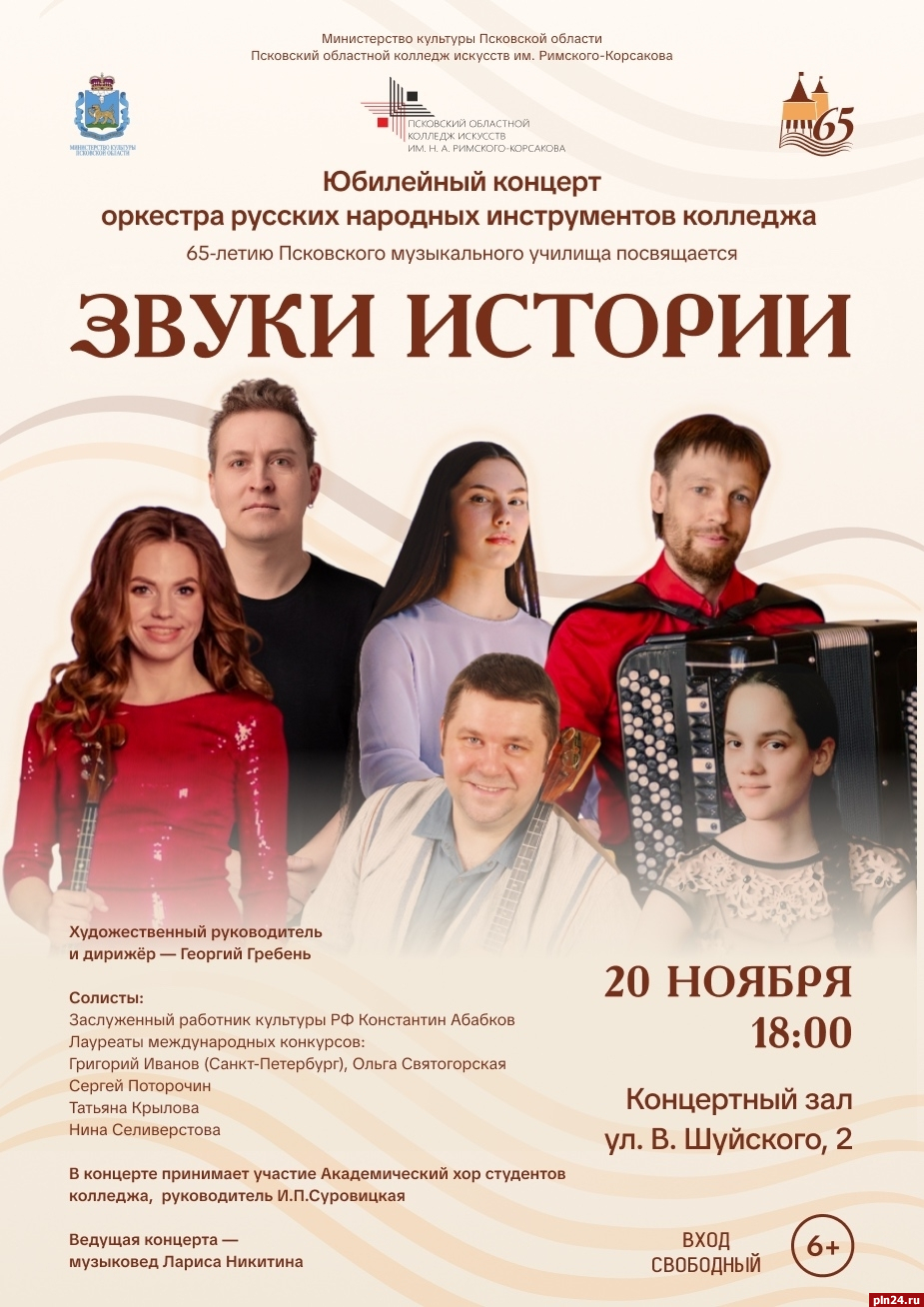 Псковский областной колледж искусств приглашает на юбилейный концерт Оркестра русских народных инструментов, который состоится 20 ноября в концертном зале музыкального отделения. Мероприятие посвящено 65-летию со дня основания Псковского областного музыкального училища, а также 65-летию самого коллектива, сообщили Псковской Ленте Новостей в колледже искусств.