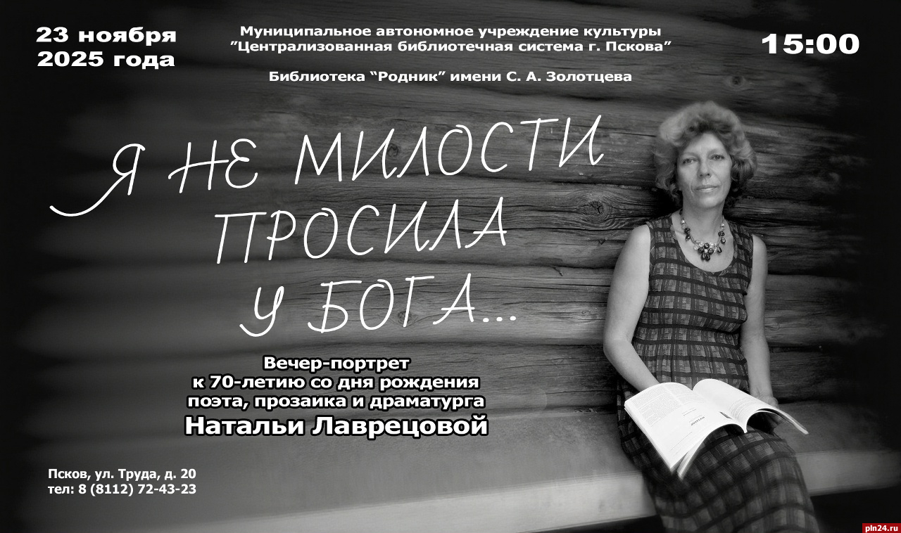 Псковская библиотека «Родник» имени С. А. Золотцева приглашает в воскресенье, 23 ноября, на литературно-поэтический вечер «Я не милости просила у Бога…», посвящённый 70-летию со дня рождения поэта, прозаика и драматурга, члена Союза писателей России Натальи Лаврецовой (1955-2022), сообщили Псковской Ленте Новостей в библиотеке.