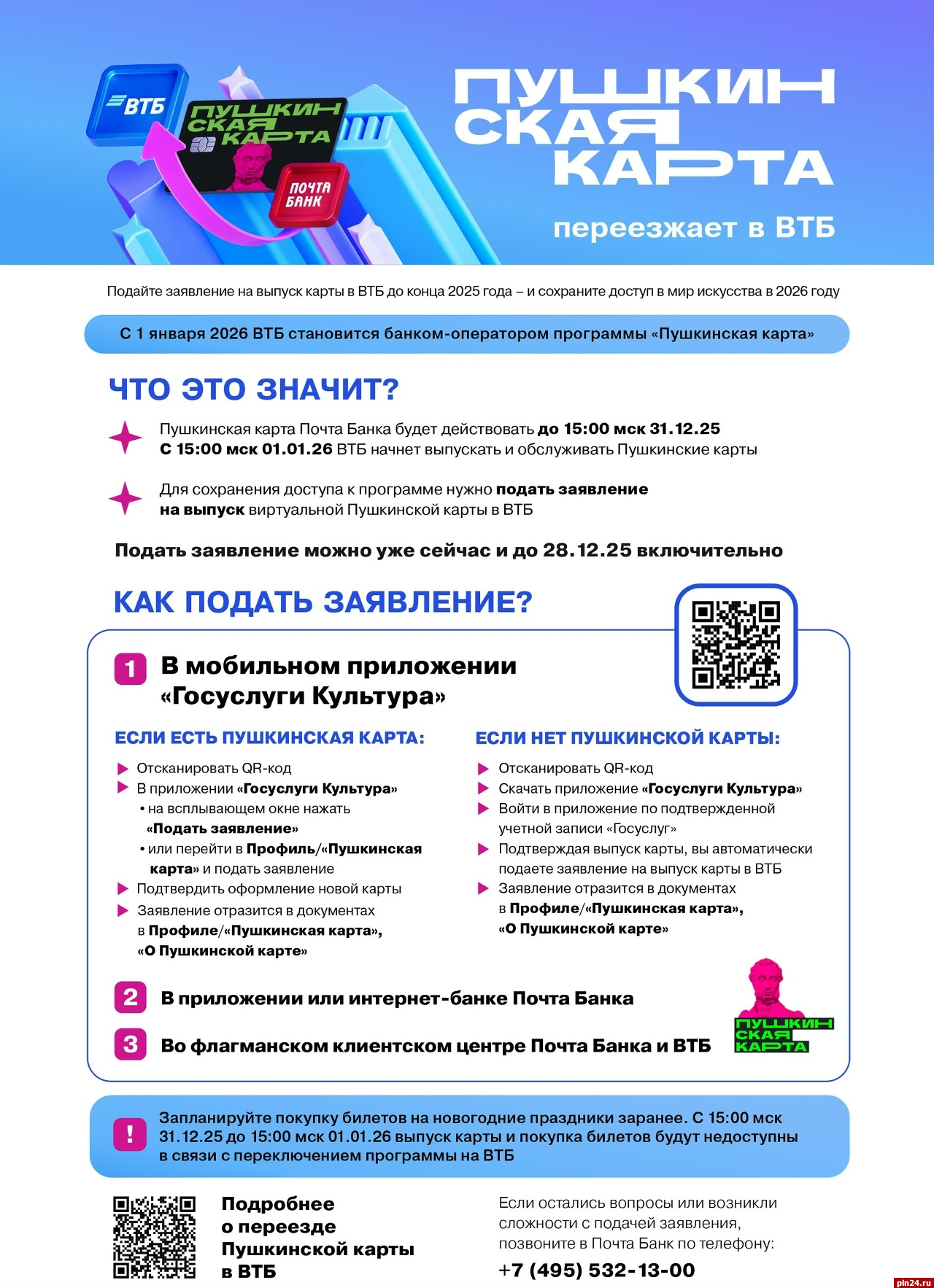 Государственный музей-заповедник «Изборск» предупредил владельцев Пушкинской карты о необходимости успеть перевыпустить ее до конца года. Как напомнили Псковской Ленте Новостей в музее, с 1 января 2026 года программа переезжает на платформу банка ВТБ, и для получения обновленной карты требуется подать заявление.