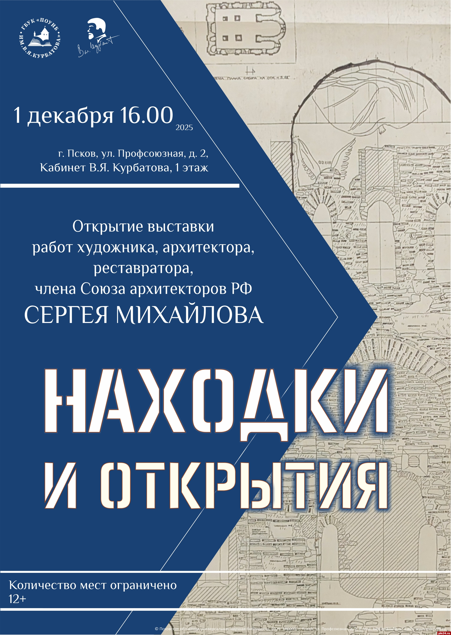 Выставка «Находки и открытия» художника, архитектора, реставратора, члена Союза архитекторов РФ Сергея Михайлова откроется в кабинете Валентина Курбатова 1 декабря в 16:00, сообщили Псковской Ленте Новостей в Псковской областной универсальной научной библиотеке имени литературного критика.