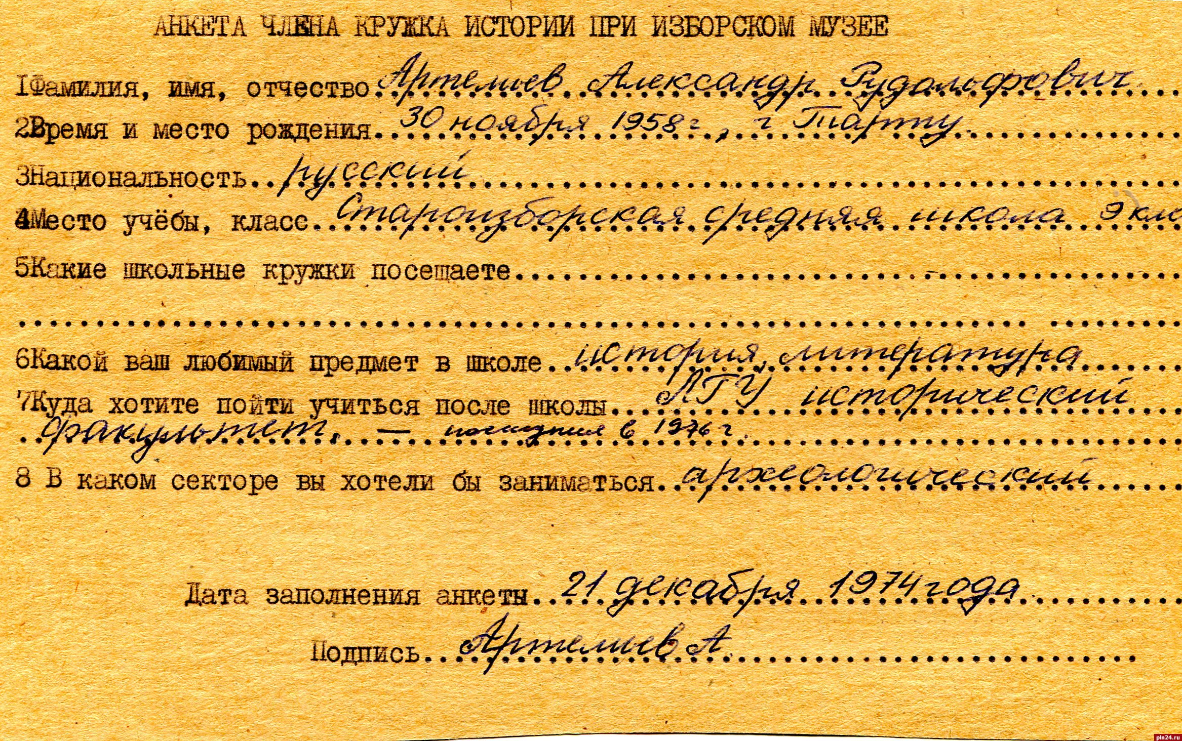 Анкета Александра Артемьева – члена кружка истории при Изборском музее от 21 декабря 1974 года
