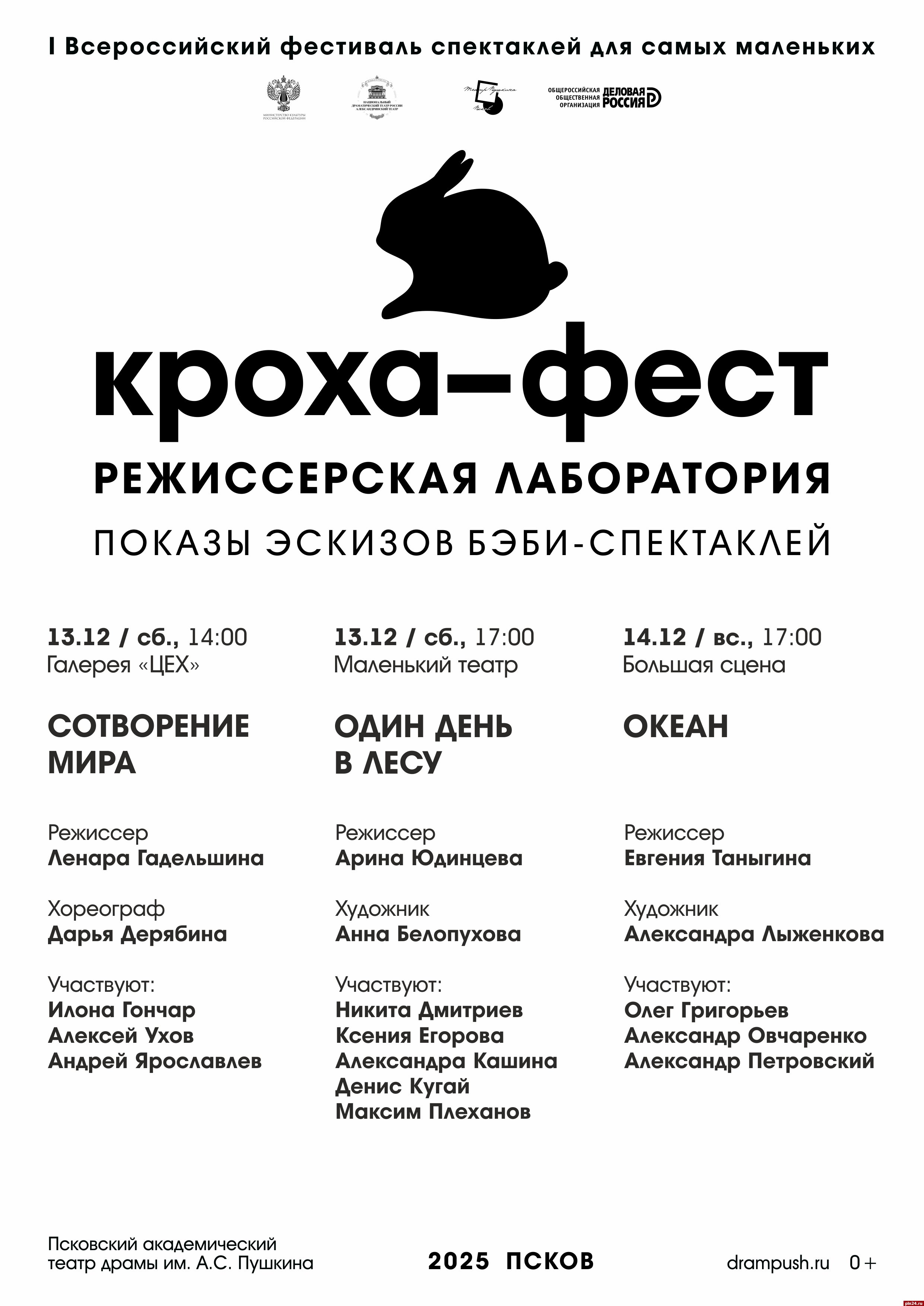 Напомним, с 9 по 14 декабря 2025 года на базе Псковского академического театра драмы имени А.С. Пушкина — филиала Национального драматического театра России (Александринского театра) — при поддержке Министерства культуры РФ состоится Всероссийский фестиваль спектаклей для самых маленьких «Кроха-фест». Фестиваль задуман как смотр достижений российских театральных коллективов в области бэби-театра и призван способствовать развитию этого направления в России. Генеральный партнер — Псковское региональное отделение Общероссийской общественной организации «Деловая Россия».