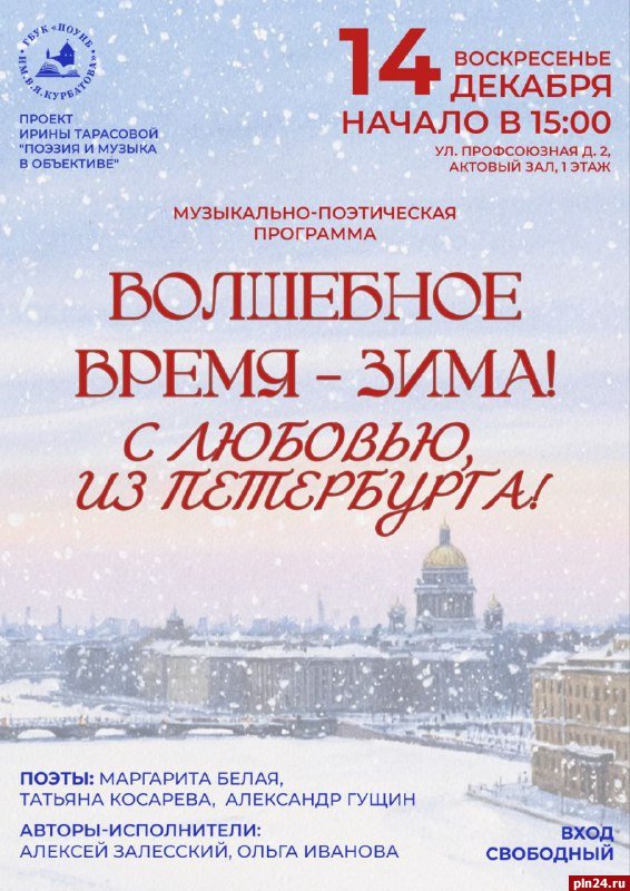 Петербургские авторы – поэты и исполнители – приглашают псковичей на предновогоднюю музыкально-поэтическую программу «Волшебное время – зима. С любовью, из Петербурга» 14 декабря, сообщили Псковской Ленте Новостей в областной универсальной научной библиотеке имени В.Я. Курбатова.