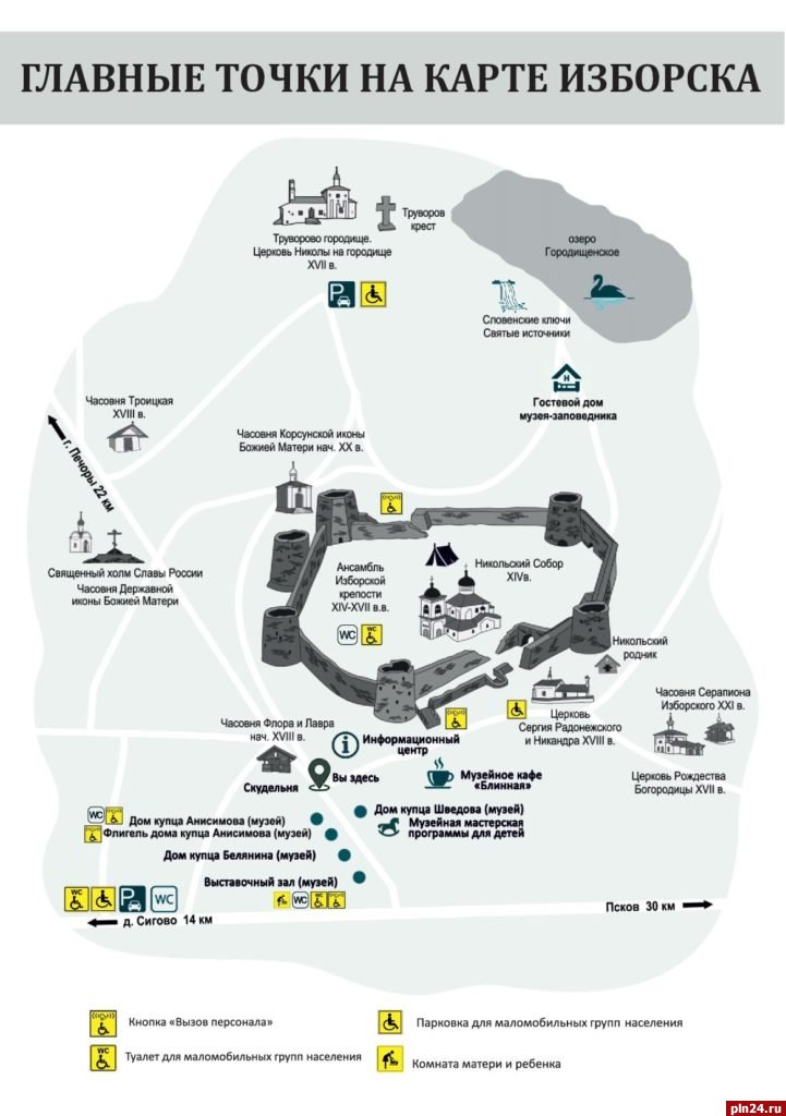 Государственный историко‑архитектурный и природный музей‑заповедник «Изборск» последовательно работает над тем, чтобы его объекты были максимально доступны для всех посетителей без исключения. На каждом объекте дежурят сотрудники — кассиры, администраторы или смотрители, — которые всегда готовы помочь в решении любых вопросов; кроме того, перед поездкой можно предварительно связаться с музеем по телефону: +7 (81148) 96‑602.
