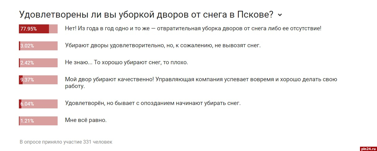 Большинство респондентов Псковской Ленты Новостей (77,95%) не удовлетворены уборкой дворов от снега в Пскове. Это следует из опроса, в котором принял участие 331 человек.