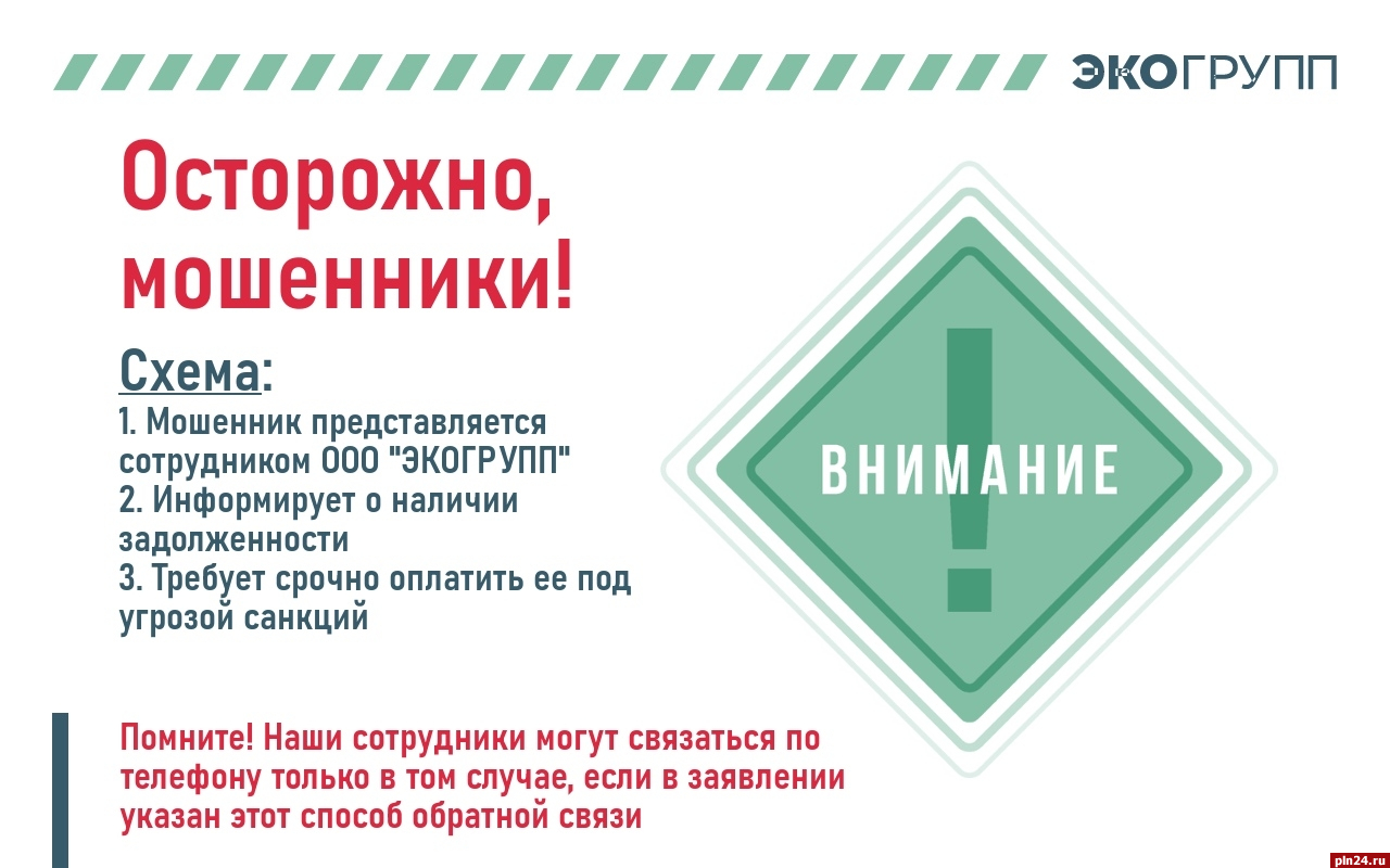 Региональный оператор по обращению с твердыми коммунальными отходами (ТКО) обращает внимание жителей области на участившиеся случаи телефонного мошенничества. Неизвестные лица, представляясь сотрудниками компании, звонят гражданам и требуют немедленно погасить задолженность за услугу. Об этом Псковской Ленте Новостей сообщили в ООО «Экогрупп».