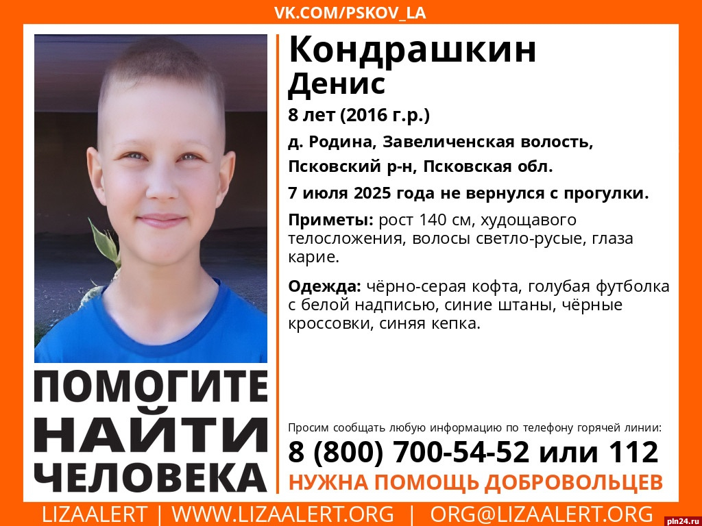 8-летний Денис Кондрашкин пропал в деревне Родина Псковского района. 7 июля он не вернулся с прогулки.