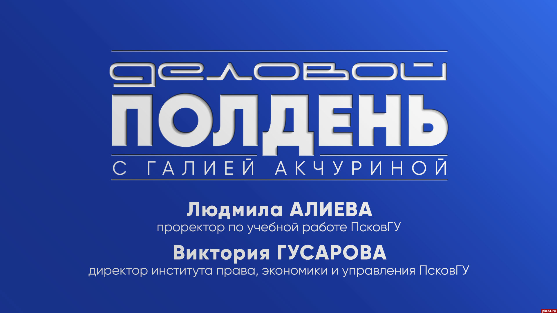 Сегодня гостями студии станут проректор ПсковГУ по учебной работе Людмила Алиева и директор института права, экономики и управления ПсковГУ Виктория Гусарова. Ведущая Галия Акчурина обсудит с ними модели эффективного взаимодействия университета и бизнеса.