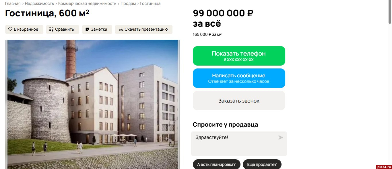Бутик-отель «Мстиславский» на набережной реки Великой в Пскове выставлен на продажу за 99 миллионов рублей на онлайн-площадке для размещения объявлений «Авито».