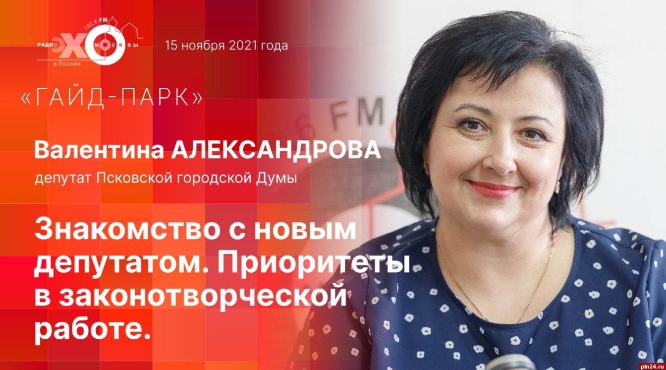 Предлагаем вашему вниманию видеотрансляцию программы «Гайд-парк», которая в эти минуты начинается в прямом эфире радио «Эхо Москвы» в Пскове (102.6 FM). Радиослушатели смогут поближе познакомиться с новым депутатом Псковской городской Думы (фракция «Справедливая Россия») Валентиной Александровой.
