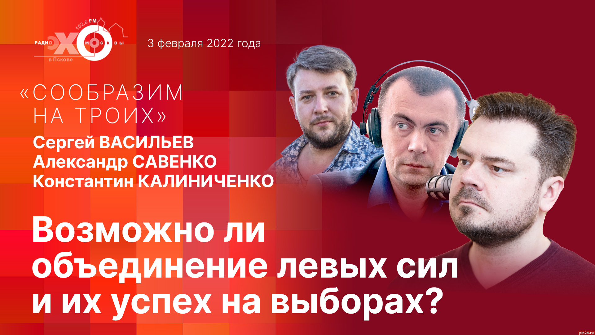 Предлагаем вашему вниманию видеотрансляцию новой программы «Сообразим на троих», которая в эти минуты начинается в прямом эфире радио «Эхо Москвы» в Пскове (102.6 FM). Постоянные соведущие Константин Калиниченко, Сергей Васильев и Александр Савенко вместе с радиослушателями обсудят актуальные темы общественно-политической жизни.