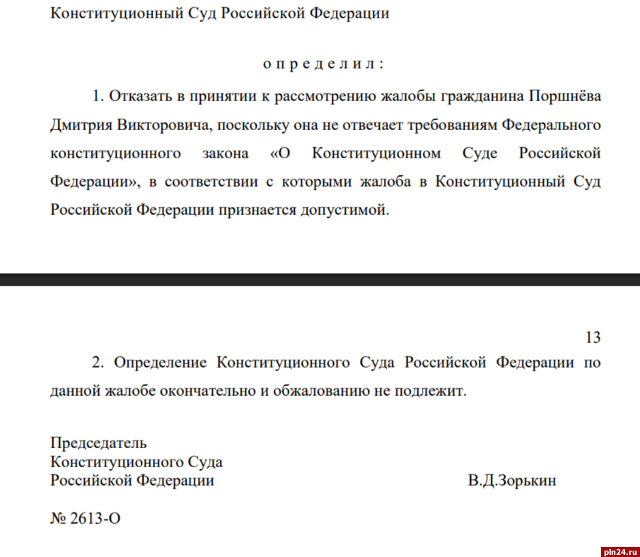 Суд определил отказать в принятии к рассмотрению жалобы Дмитрия Поршнева, поскольку она не отвечает требованиям федерального конституционного закона «О Конституционном суде Российской Федерации», в соответствии с которыми жалоба в Конституционный суд Российской Федерации признается допустимой.