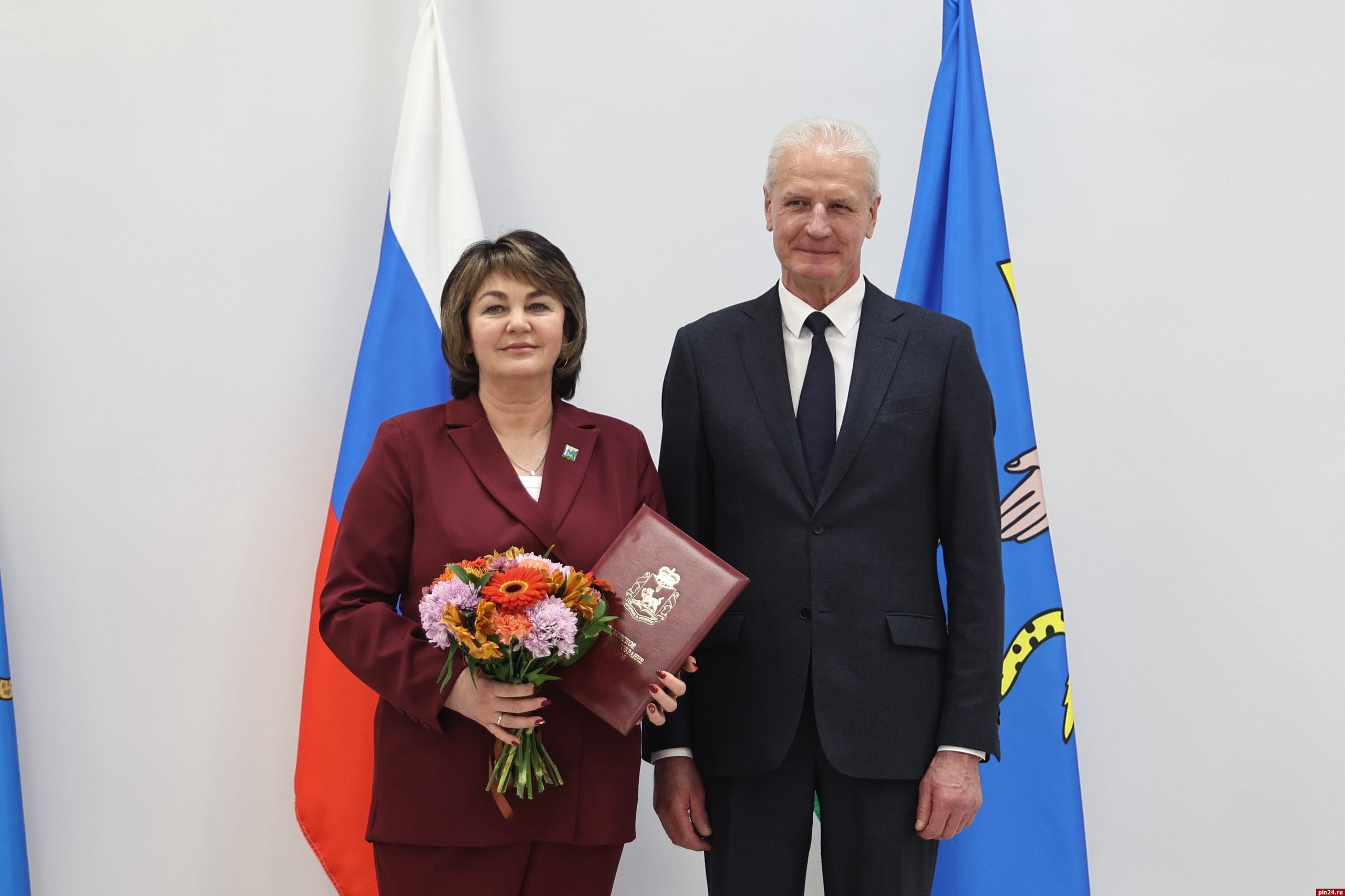 В начале торжественного мероприятия Наталья Фёдорова получила удостоверение главы Псковского муниципального округа и принесла присягу, пообещав честно и добросовестно исполнять свои обязанности на этом посту.