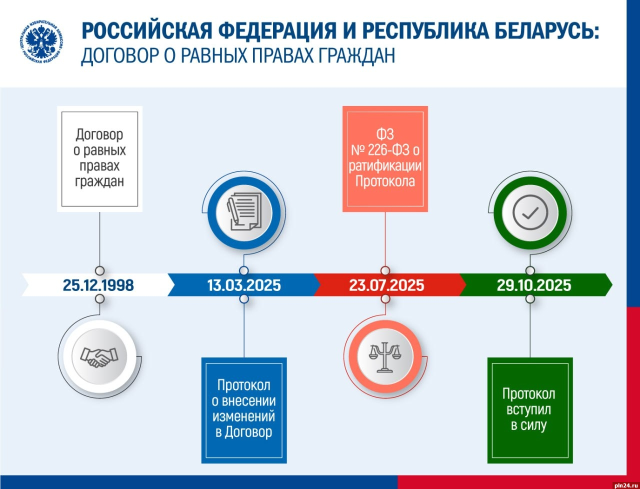 29 октября 2025 года вступил в силу протокол о внесении изменений в договор между Российской Федерацией и Республикой Беларусь о равных правах граждан, пишет ЦИК России.