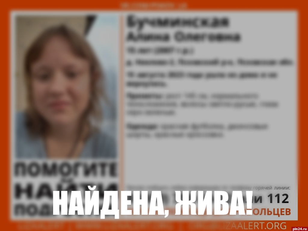 Найдена пропавшая в Псковском районе Алина Бучминская 2007 года рождения. Об этом Псковской Ленте Новостей сообщили в региональном отделении поискового отряда «ЛизаАлерт».