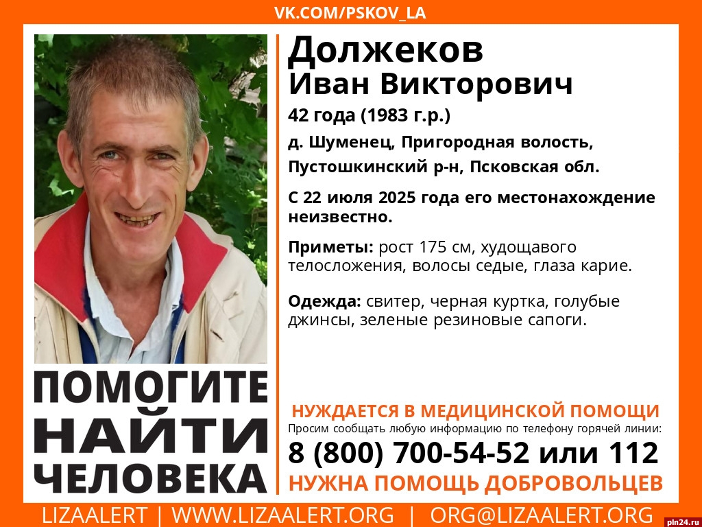 42-летний Иван Должеков пропал в деревне Шуменец Пустошкинского округа. С 22 июля его местонахождение неизвестно, сообщили Псковской Ленте Новостей в региональном отделении поискового отряда «ЛизаАлерт».