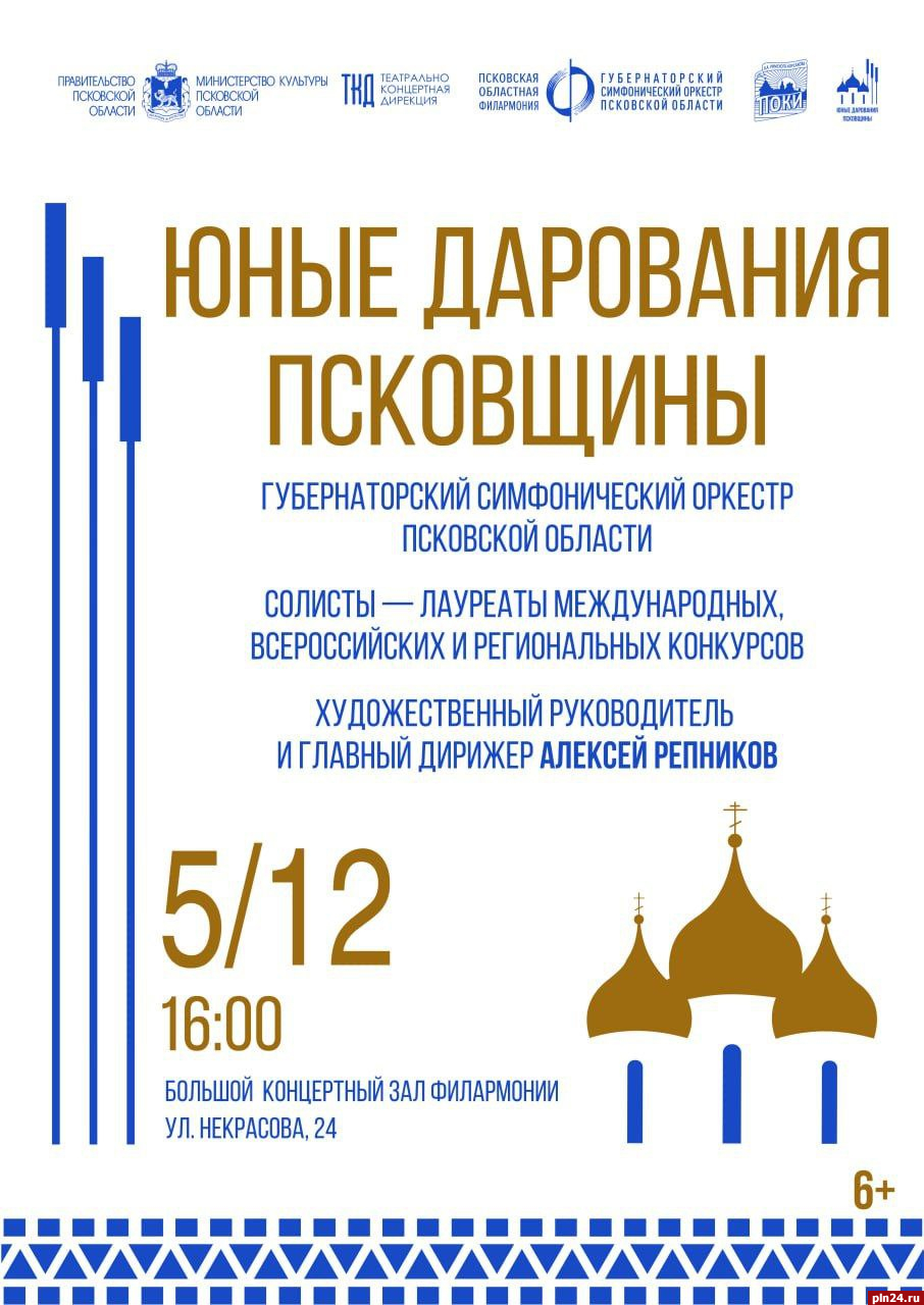 Концерт «Юные дарования Псковщины» пройдет в большом концертном зале Псковской областной филармонии 5 декабря. Молодые талантливые музыканты выступят с Губернаторским симфоническим оркестром Псковской области под художественным руководством Алексея Репникова. Об этом Псковской Ленте Новостей сообщили в филармонии.