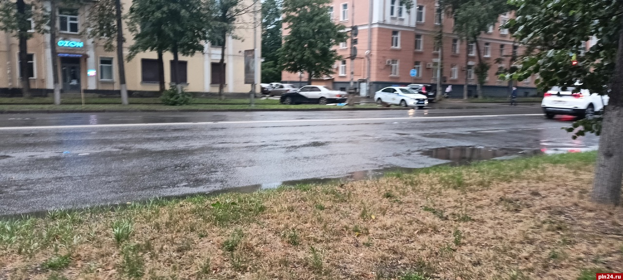 Дорожный знак сбил автомобиль на Октябрьском проспекте в Пскове. Снимок 4 июля опубликован в группе «Жесть по-псковски» в социальной сети «ВКонтакте».