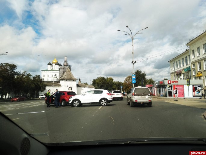 Дорожная авария произошла на площади Ленина, напротив дома №1. Проезжую часть не поделили автомобили «Киа» и «Мицубиси». Оба транспортных средства занимают две полосы для движения в сторону Запсковья.