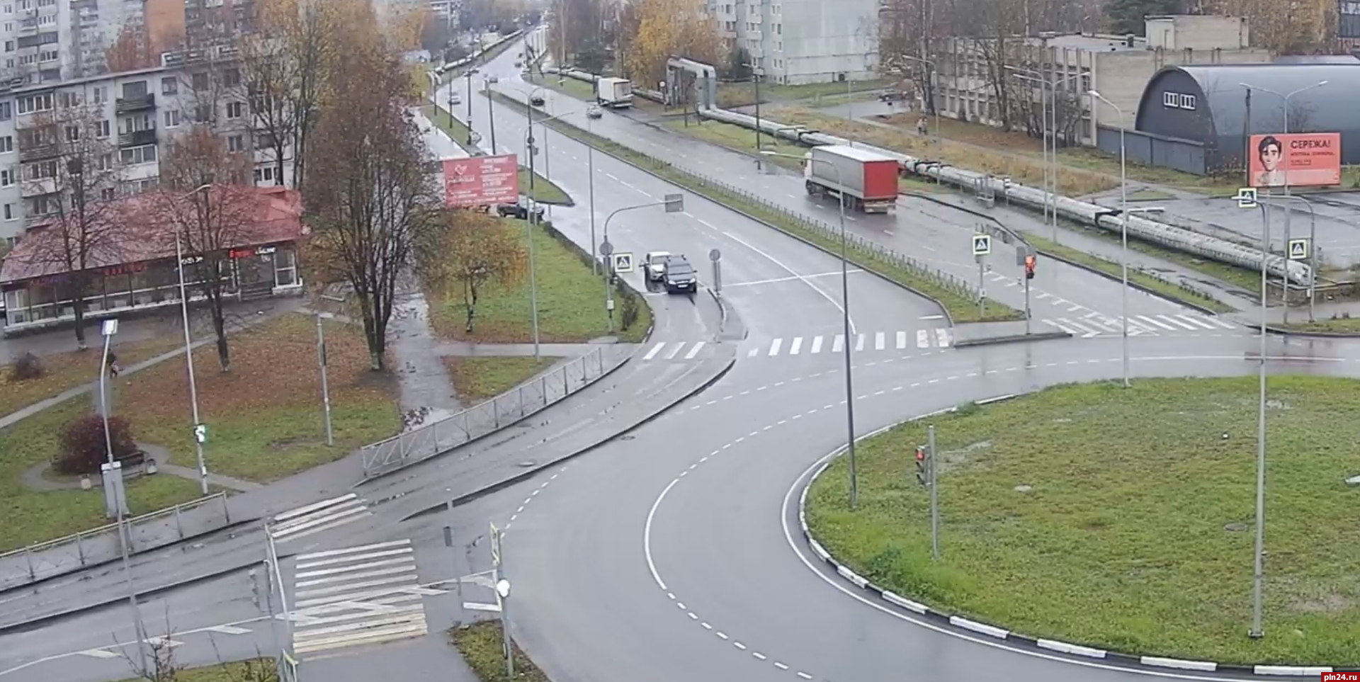 Дорожно-транспортное происшествие рядом с круговым перекрестком улиц Инженерной и Индустриальной в Пскове попало на видео. Видеокамера Pskovline зафиксировала происшествие 3 ноября в 11:07.
