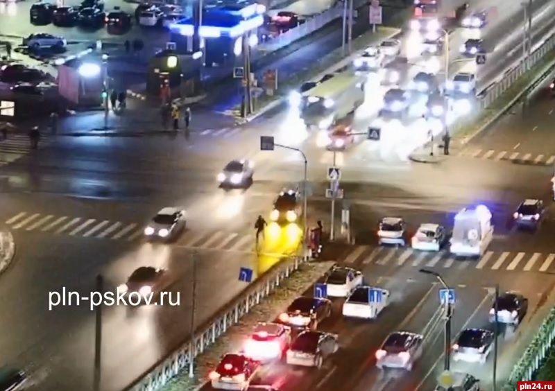 Произошедшее на перекрестке улиц Юбилейной и Коммунальной зафиксировала видеокамера Pskovline. Водитель автомашины двигался через перекресток по улице Юбилейной в прямом направлении в сторону Рижского проспекта в крайней левой полосе. Пешеход стоял на островке безопасности, затем вышел на проезжую часть, намереваясь перейти 4 полосы для движения.
