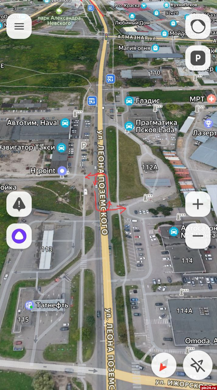 Рассмотрим обновлённую улицу Леона Поземского от перекрёстка с Ижорского Батальона (салон Omoda) до Шоссейной (Псковский мясокомбинат). Сама улица приобрела новый вид: освещение, хорошая дорога, но есть одна проблема — километр без возможности разворота.