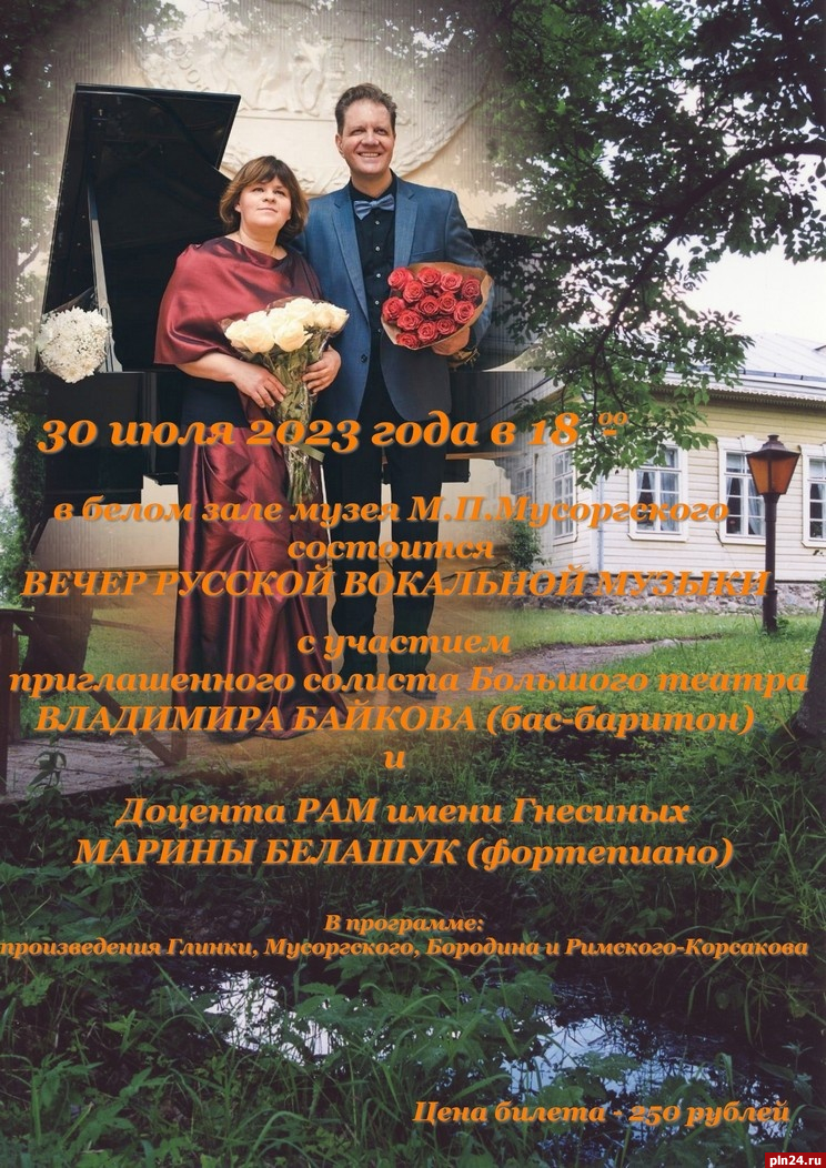 Концерт классической русской музыки состоится в белом зале музея-усадьбы композитора М. П. Мусоргского 30 июля в 18:00. В мероприятии примут участие приглашенные гости – солист Большого театра Владимир Байков и доцент РАМ имени Гнесиных Марина Белашук. Об этом Псковской Ленте Новостей сообщили в пресс-службе Псковского музея-заповедника.