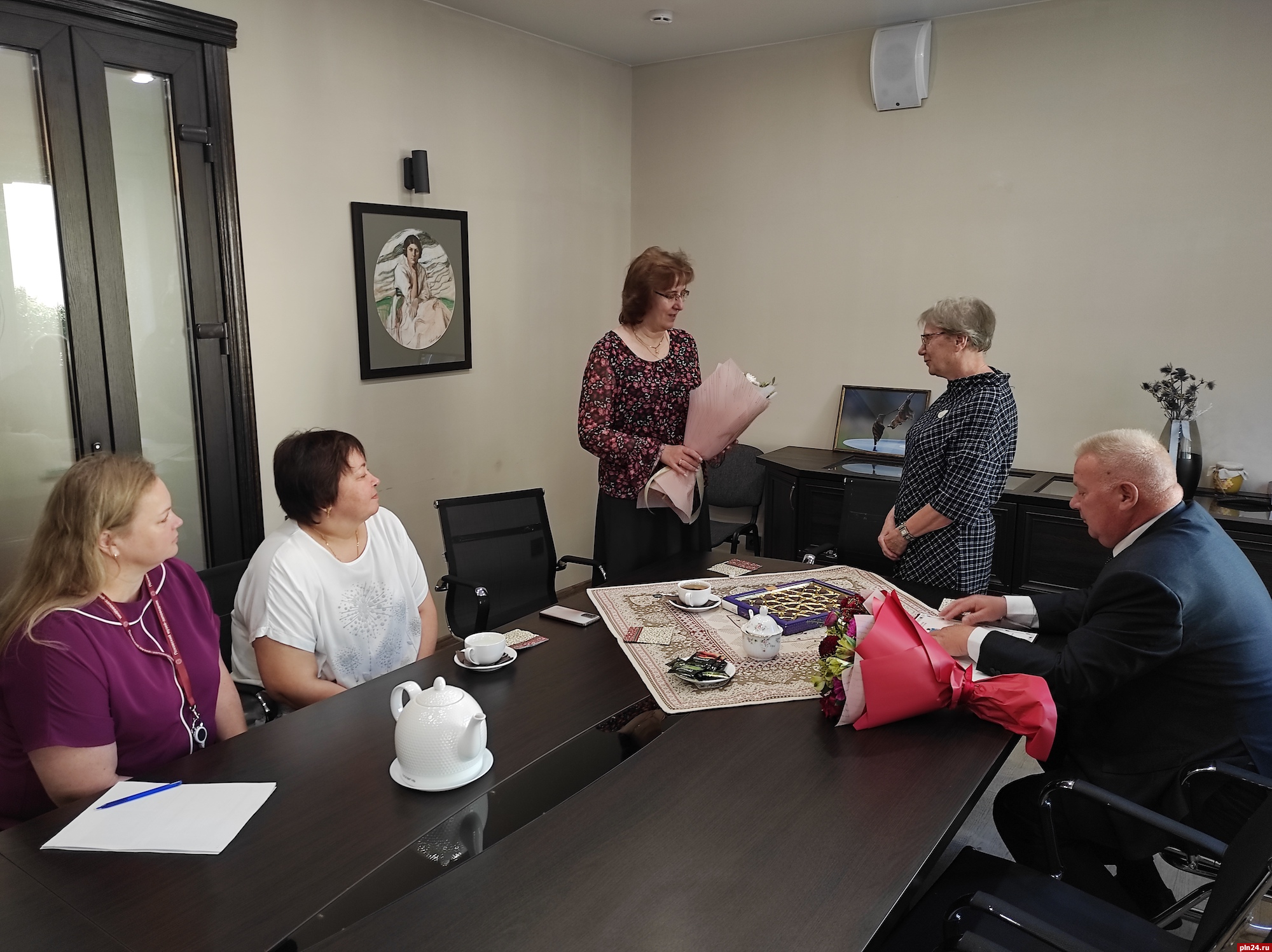 В торжественной обстановке ей вручили благодарность, цветы, пожелали крепкого здоровья и реализации новых амбициозных проектов, которые будут способствовать дальнейшему развитию культуры Псковской области и продвижению Псковского музея-заповедника.