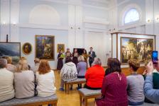 В ходе мероприятия сотрудник художественного отдела, хранитель экспозиции Картинной галереи Мария Проценко рассказала участникам о жизни и творчестве Айвазовского и познакомила с работами из собрания музея. Специально для экскурсии в этот день из фондов были выставлены две картины художника – «Христос, идущий по морю» и «Берег моря или Прибой у скалистого берега».