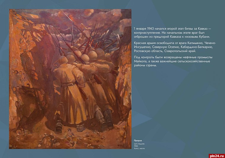 К 80-летию победы советских войск в битве за Кавказ Музей Победы подготовил виртуальную выставку «На высоте». Жителей Псковской области приглашают познакомиться с онлайн-экспозицией на сайте культурной площадки. Зрителям расскажут об истории этого сражения, представят редкие фотоснимки военных лет, документы, рисунки фронтовых художников, сообщили Псковской Ленте Новостей в пресс-службе Музея Победы.