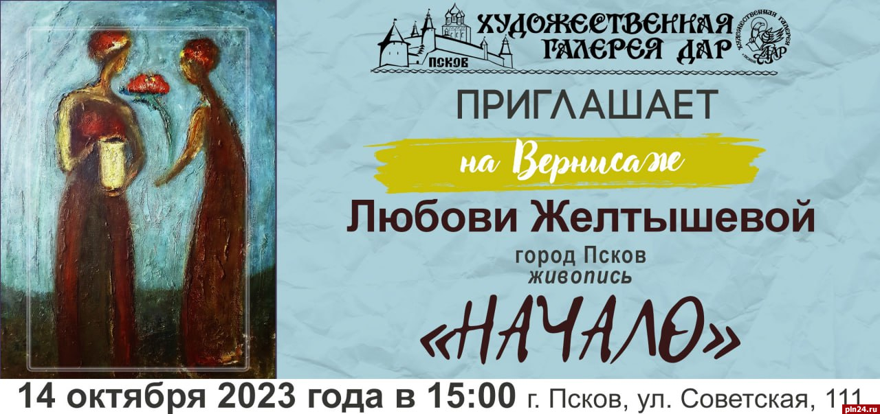 Персональная выставка самобытной псковской художницы Любови Желтышевой «Начало» откроется в Пскове 14 октября в 15:00. Об этом Псковской Ленте Новостей сообщили в художественной галере «Дар».